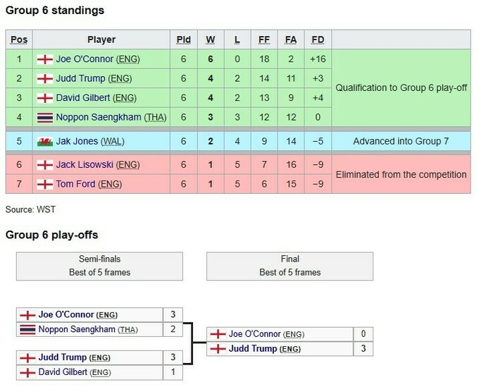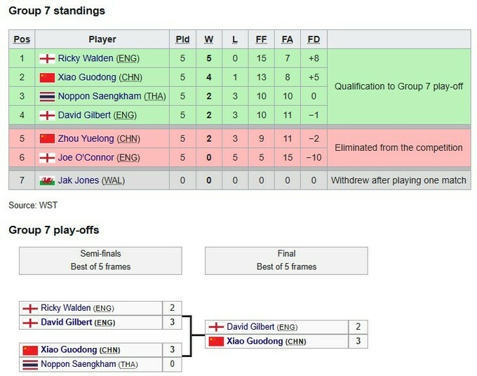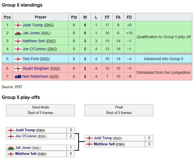 Из последних трех групп в финал семи пробились Мэттью Селт, Джадд Трамп (лидер мирового рейтинга) и китаец Сяо Годун.