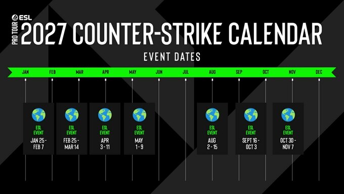 Организатор турниров ESL анонсировал дать главные события Pro Tour в 2027 году. Всего запланировано восемь турниров, которые будут проходить с января по ноябрь.