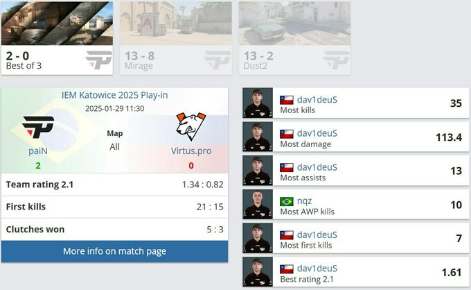 Бразильская команда paiN продолжает впечатлять в начале 2025 года, одержав уверенную первую победу над virtus pro в четвертьфинале турнира BLAST Bounty, а сегодня завершила серию со счетом 2:0 на IEM Katowice.
