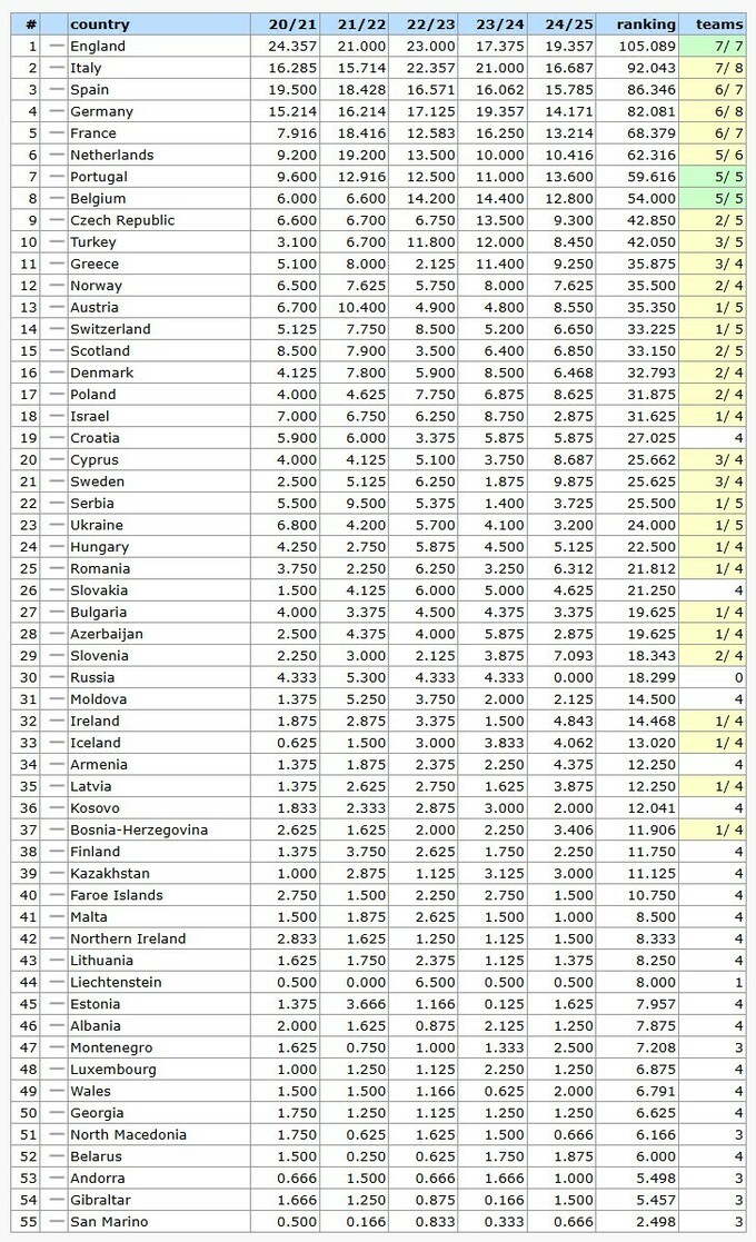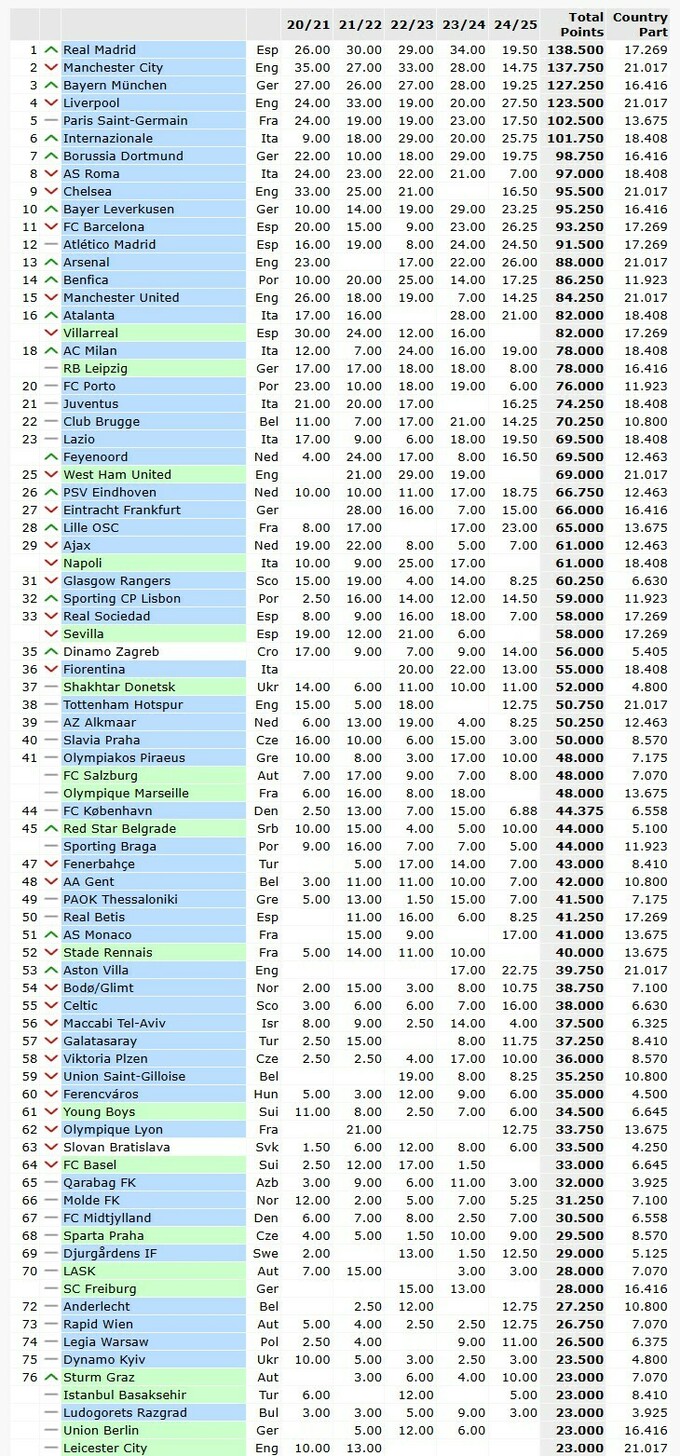 По итогам сыгранных поединков произошли небольшие изменения в таблице коэффициентов УЕФА.