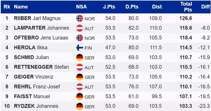 Победителем соревнования стал лидер общего зачета Кубка мира Магнус Риибер, получивший в итоге 126.6 баллов. Интересно, что накануне этапа в Зеефельде Магнус сообщил о завершении карьеры. Вторую и третью позицию заняли австриец Йоханнес Лампартер и норвежец Йенс Лурос Офтебро соответственно.