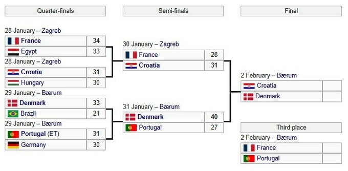 Днем ранее в полуфинале в Загребе сборная Хорватии перед родной публикой сенсационно обыграла команду Франции (31:28).