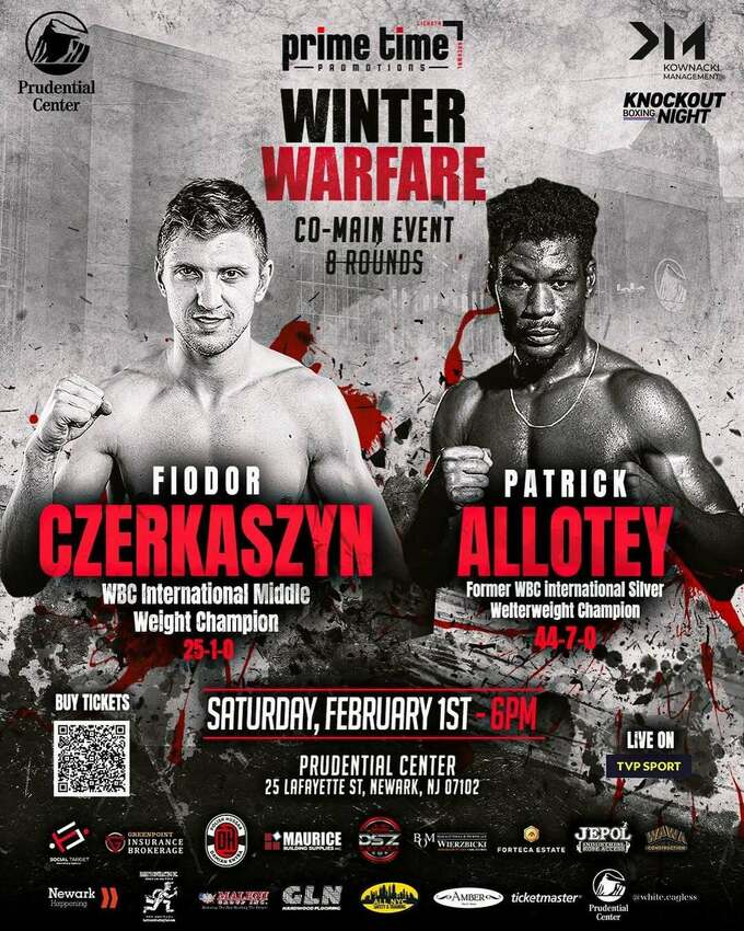 Во втором по значимости событии сойдутся представители среднего веса (до 72,6 кг) – украинский боксер, который выступает за Польшу, Федор Черкашин (25–1, 15 КО) проведет бой против опытного Патрика Аллотея (44–7, 34 КО) из Ганы.