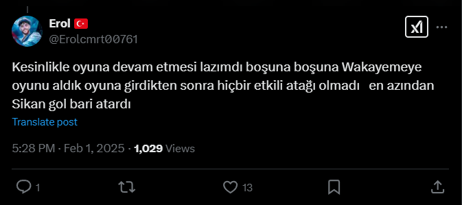Erol: «Он определенно должен был остаться в игре, мы зря купили Нвакаеме, у него не было ни одной результативной атаки после того, как он вошел в игру, по крайней мере, Сикан думаю мог забить бы гол».