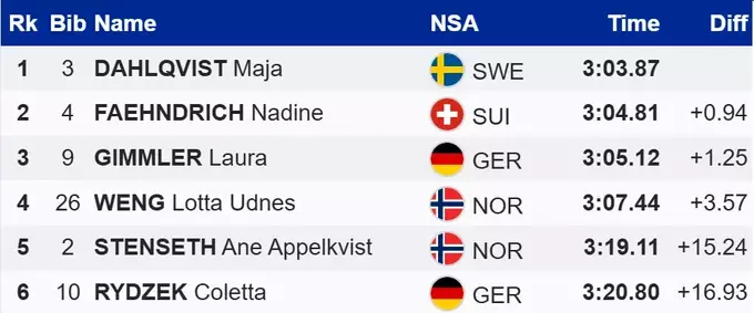 С отрывом в 0.94 секунды первую позицию заняла шведка Майя Дальквист. Второе место за представительницей Швейцарии Надин Фендрих, третье – немка Лаура Гиммлер.