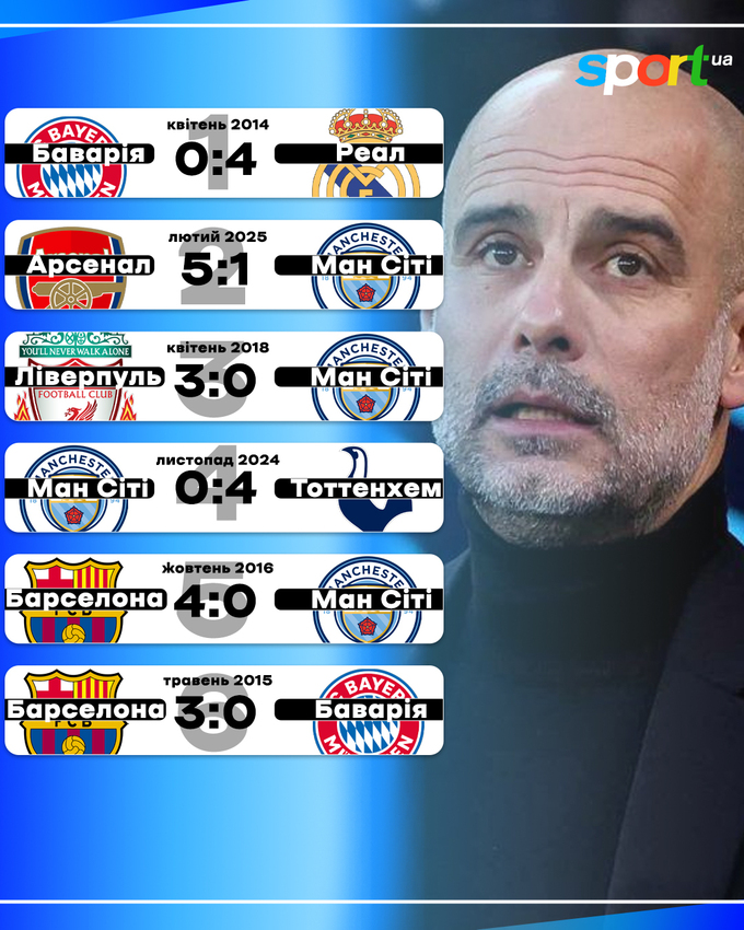 Рейтинг самых унизительных фиаско Гвардиолы. На каком месте недавние 1:5?