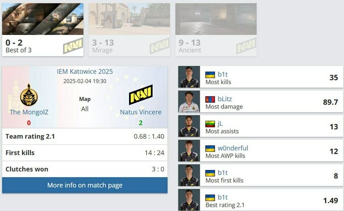4 февраля украинский клуб Natus Vincere уверенно победил The MongolZ в матче за выход в полуфинал IEM Katowice. Игра завершилась со счетом 2:0, и теперь NAVI начнут плей-офф сразу с полуфинала.