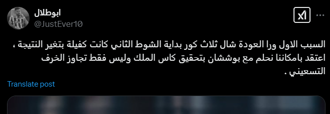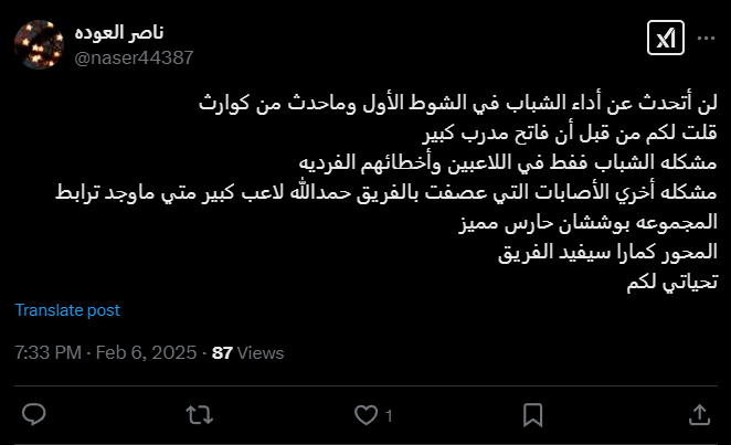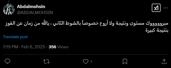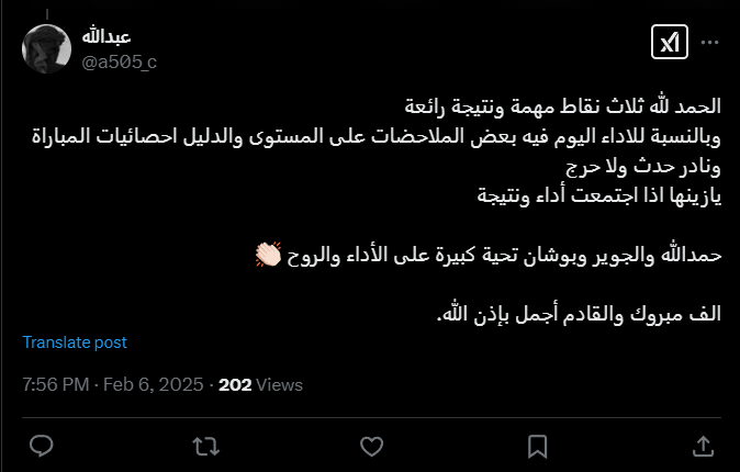A505_c: «Слава Богу, три важных очка и отличный результат. Что касается сегодняшнего выступления, то есть несколько замечаний по уровню, и доказательством тому служит статистика матча. Редко можно встретить что-то подобное. Как прекрасно, когда результативность и результаты сходятся воедино Хамдалла, Аль-Джовайр и Бушан, большой респект за игру и дух. Поздравляем, и пусть будущее будет еще прекраснее».
