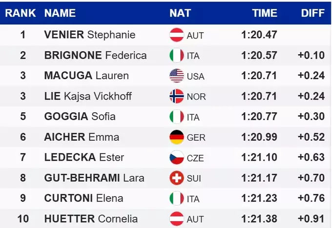 Вторую медаль на ЧМ, а также первое золото, завоевала представительница Австрии Стефани Венир. Спортсменке удалось удержать лидерство, обойдя ближайшую конкурентку на 0.10 секунды. Второй стала итальянка Федерико Бриньоне.