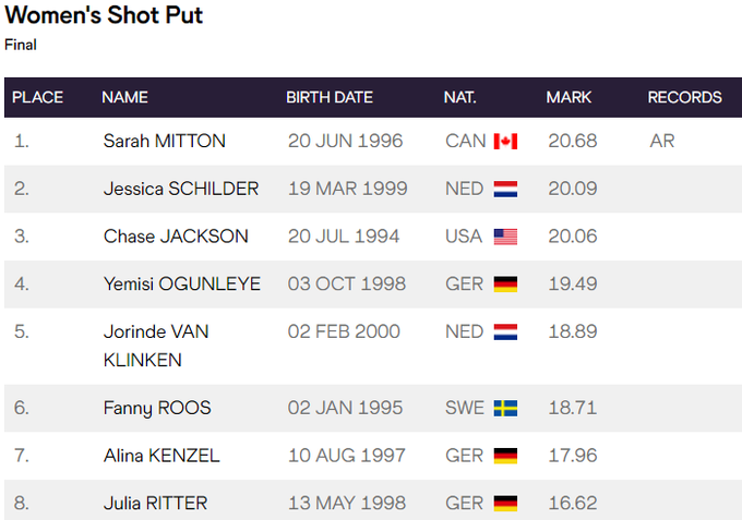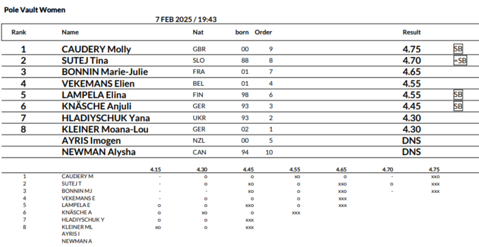 Бронзу добыла Мари-Жюли Боннин (Франция) с результатом 4.65, вторая – Тина Сутей (Словения), которая преодолела высоту 4.70, а чемпионство завоевала Молли Каудери (Великобритания) – 4.75 метров.