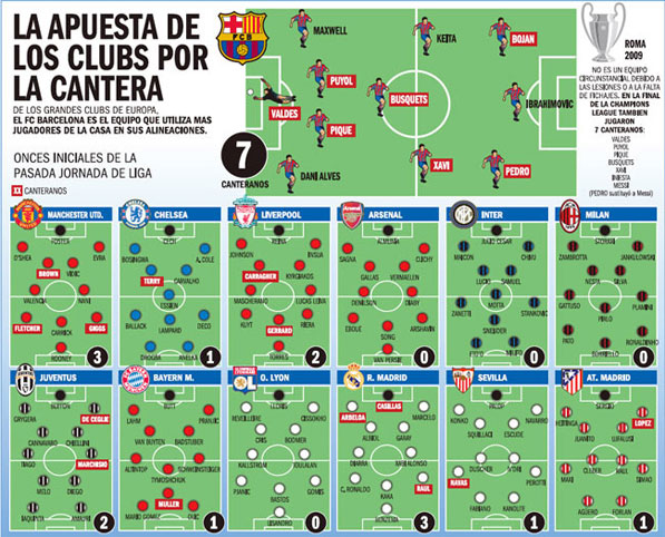 Каталонское издание Sport.es не упустило случая отдать должное «Барселоне». Журналисты составили вот такую картинку, где показали число воспитанников в основах ряда лучших клубов Европы (по последним матчам). Преимущество «Барсы», конечно же, было существенным - 7 человек против 3 у «Реала» и «МЮ». А вот у миланских суперклубов в основах не было ни одного своего, родненького.