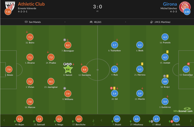 Главным героем матча стал хавбек «Атлетика» Ойана Сансет, который оформил хет-трик и получил самую высокую оценку в матче – 8.6 баллов.