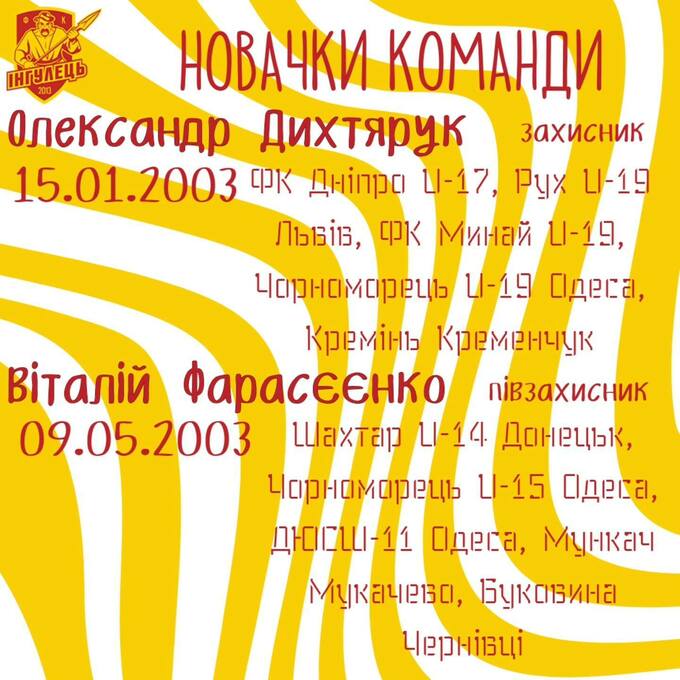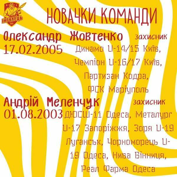 Также новичками стали три защитника – Александр Дихтярук из «Кременя», Александр Жовтенко из ФСК «Мариуполь» и Андрей Меленчук, выступавший за «Реал Фарму».