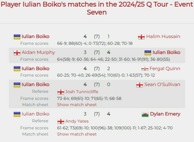 Украинский снукерист Юлиан Бойко проиграл в 1/2 финала 7-го турнира аматорской серии Q Tour сезона 2024/25, который проходит в Landywood Snooker Club в английском регионе Стаффордшир.