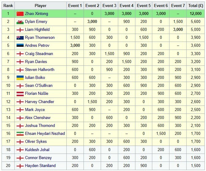 Лидер рейтинга Чжао Синьтун из Китая получил прямую путевку в Мировой тур.