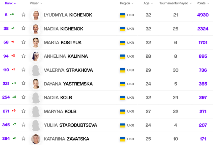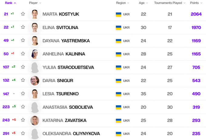 Топ-10 украинок в рейтинге WTA
