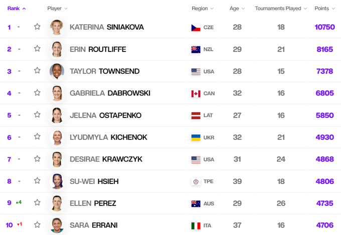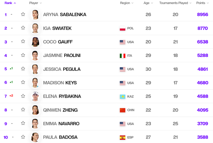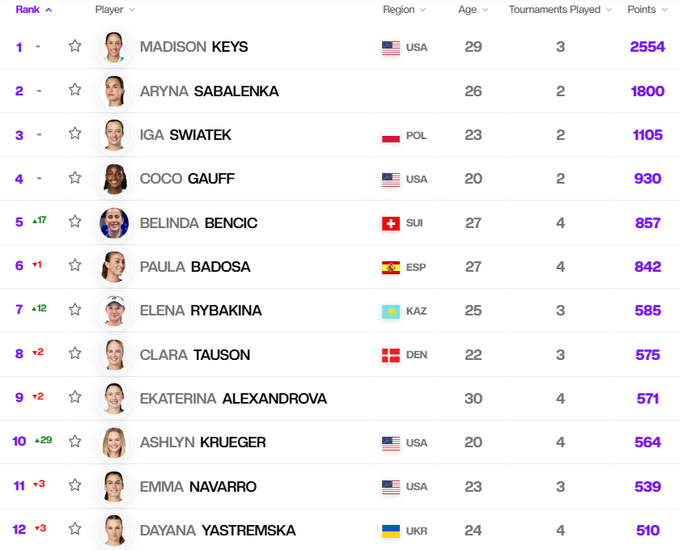 В гонке WTA лидером является Мэдисон Киз, вторая и третья позиции у Арины Соболенко и Иги Свентек соответственно.
