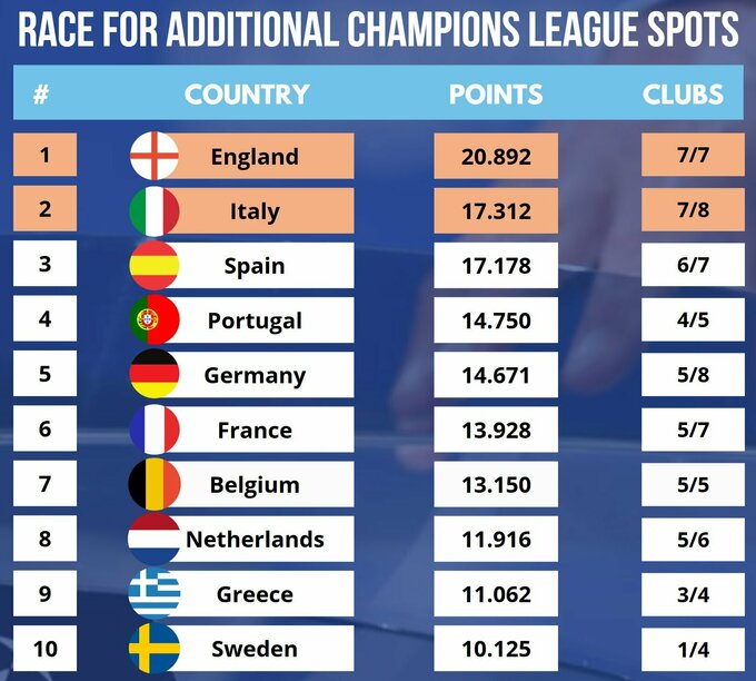 Лучшие две страны получат дополнительную путевку в ЛЧ 2024/25.