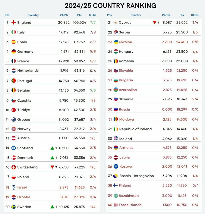 Страны-лидеры в рейтинге УЕФА за сезон 2024/25
