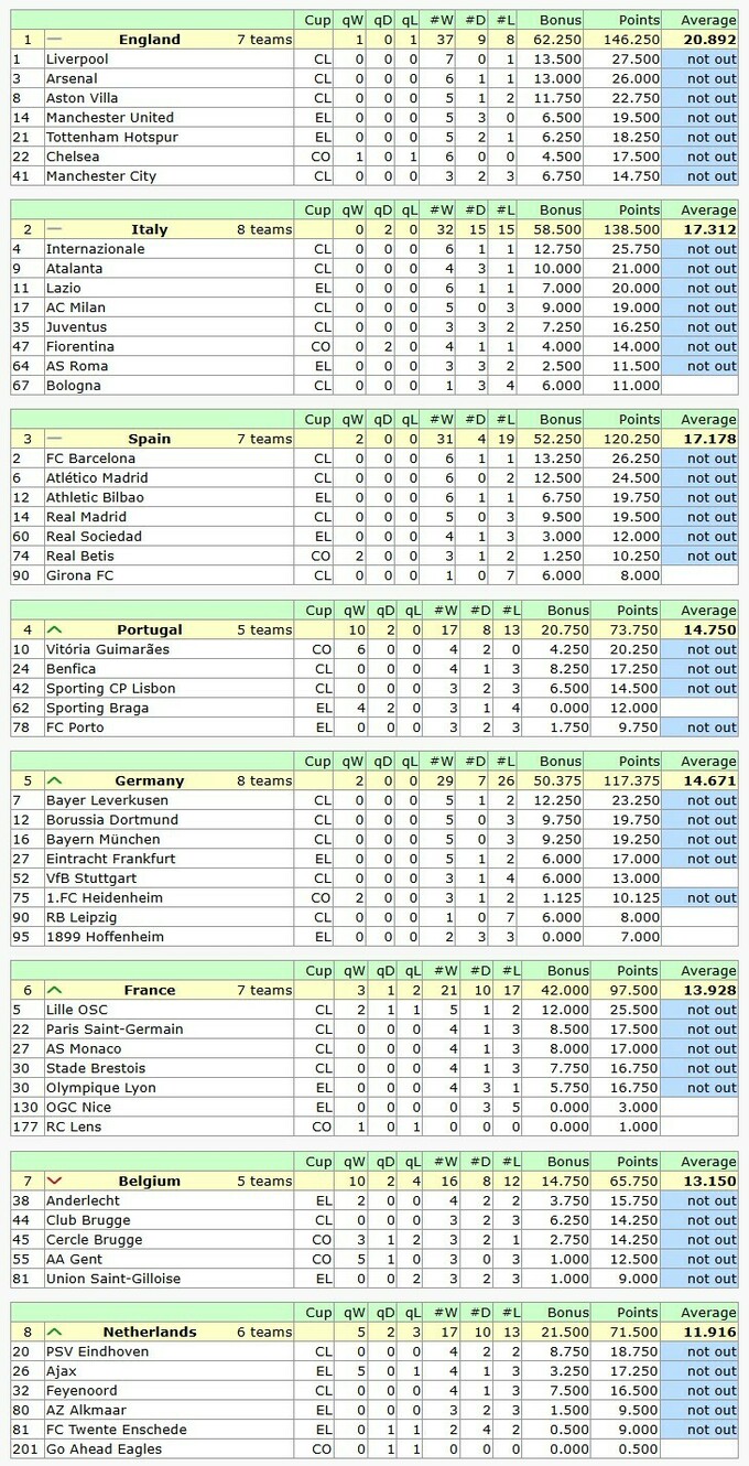 Коэффициент УЕФА для стран рассчитывается так: количество набранных очков (2 за победу, 1 за ничью, плюс бонусы; квалификационные раунды учитываются как 50%) делятся на количество стартовавших в евросезоне команд от страны.