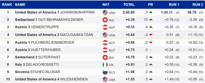 За ними расположилась сборная Швейцарии (Лара Гут-Бехрами и Венди Холденер), которые проиграли лидерам 0.39 секунды. Тройку замкнул тандем из Австрии (Стефани Венир и Катарины Труппе).