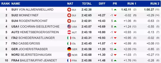 Все первые три места на пьедестале заняли представители из Швейцарии. Первым финишировали Францо Фон Алльмен и Лоик Мейяр, завершившие соревнования с общим временем 2:42.38. Серебряными призерами стали Алексис Монне и Танги Неф, тройку замкнул тандем Стефан Рогентен и Марк Роша.