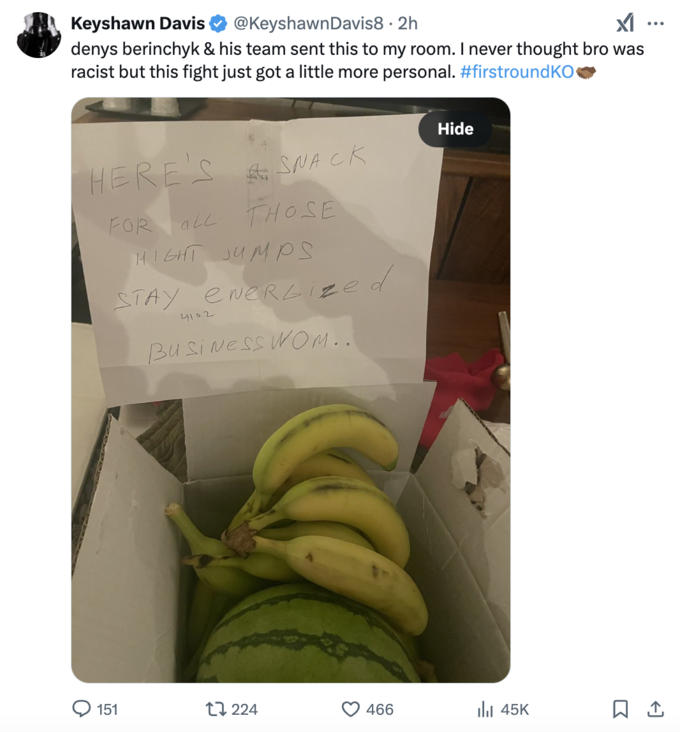 Накануне боя Кейшон Дэвис рассказал, что ему подбросили бананы, обвинив Беринчика в расизме.