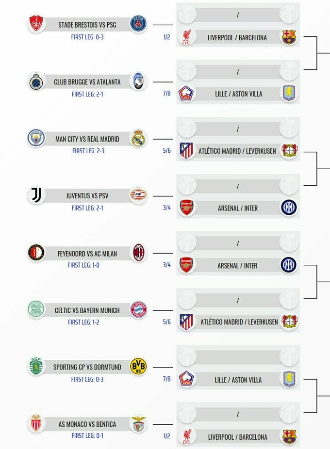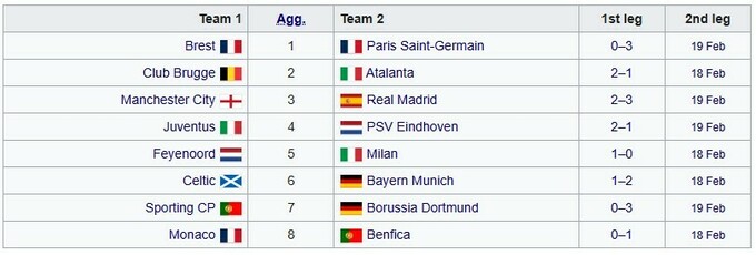 8 лучших команд по итогам основного раунда ЛЧ автоматически вышли в 1/8 финала (Ливерпуль, Барселона, Арсенал, Интер, Атлетико Мадрид, Байер, Лилль, Астон Вилла).