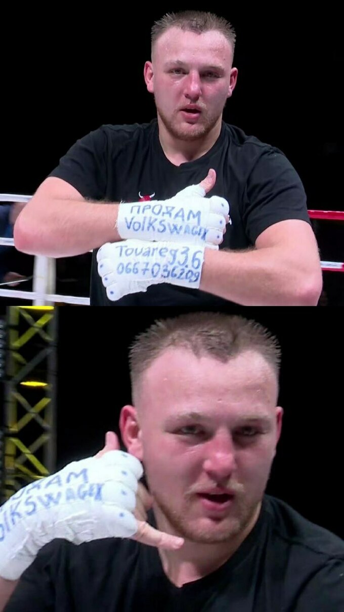 Спортсмен снял перчатки после окончания раунда и показал на камеру затейпированные руки, на которых было что-то написано. Когда Виталий подошел ближе к оператору, зрители увидели объявление о продаже автомобиля.