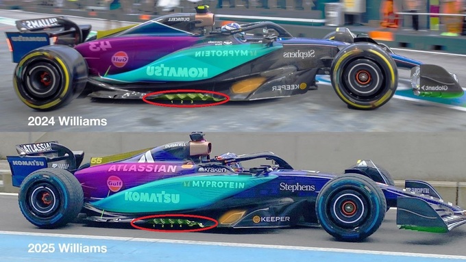 Кроме того, в зоне поворотных лопаток днища заметны изменения: их расположение стало немного агрессивнее, а геометрия более сложной (обозначено красным эллипсом). Это может указывать на попытку Уильямс усилить влияние передней части днища на общую аэродинамическую эффективность. Усиленная работа диффузора во взаимодействии с этими элементами позволит создавать больший уровень прижимной силы, но что еще важнее – сделает ее более стабильной, обеспечивая предсказуемое поведение болида в поворотах.