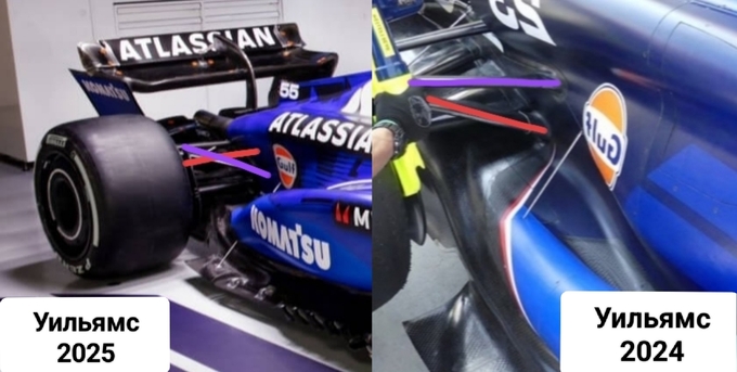 Обновлённый FW47 получил заметные изменения в зоне боковых понтонов. Новый профиль сайдподов теперь больше напоминает концепцию Макларен MCL38, что отличается от компактного дизайна FW46 (показано голубым на фото сверху). Это решение призвано эффективнее контролировать воздушные потоки над верхней поверхностью кузова и направлять больше воздуха к центру болида. Такой подход может улучшить стабильность воздушных потоков, что особенно важно для эффективной работы днища, в частности в центральной части дна болида на низких скоростях.