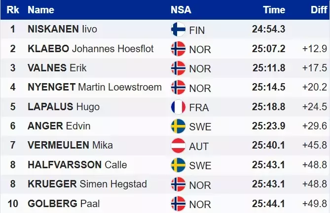 Триумфатором соревнования стал трехкратный чемпион Олимпийских игр Иво Нисканен. Финский спортсмен обогнал ближайшего конкурента на 12.9 секунды. За ним расположился лидер общего зачета Йоханнес Клэбо, перед этим выигравший спринт в Фалуне. Третью позицию занял другой норвежец Эрик Вальнеш.