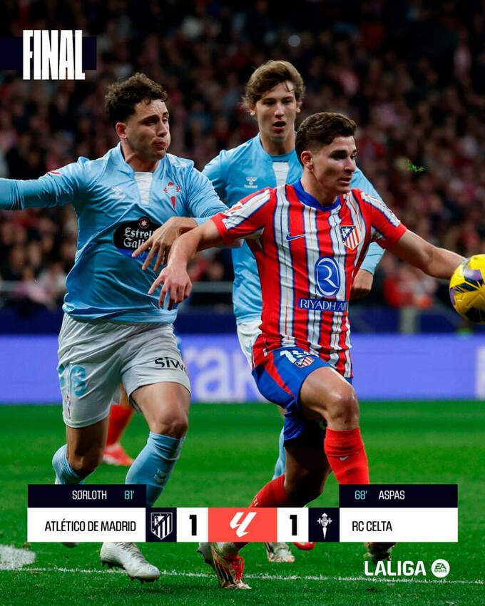 Первым на 68-й минуте отличился Яго Аспас, который реализовал пенальти. Александер Серлот вырвал ничью для подопечных Диего Симеоне на 82-й.