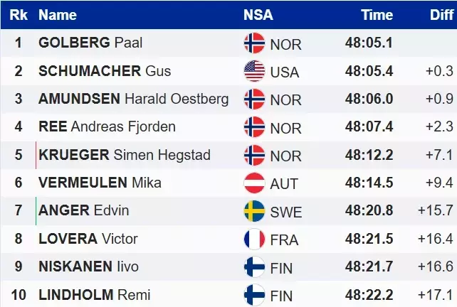 Первую победу в текущем сезоне оформил норвежец Пол Гулберг. Проиграв 0.3 секунды, вторым стал американец Гас Шумахер, тройку замкнул другой норвежец Харальд Остберг Амундсен.
