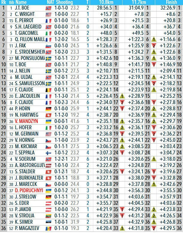 Капитан сборной Украины Дмитрий Пидручный проиграл лидеру 3 минуты и 35 секунд, кроме того, биатлонист не закрыл три мишени на огневых рубежах. Как результат, Дмитрий оказался на 30-м месте.