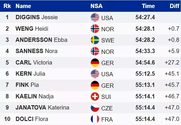 Пятую победу в текущем сезоне оформила лидер общего зачета Джессика Диггинс. На финише спортсменка опередила норвежку Хейди Венг и шведку Эббу Андерссон, которые продемонстрировали второй и третий результаты соответственно.