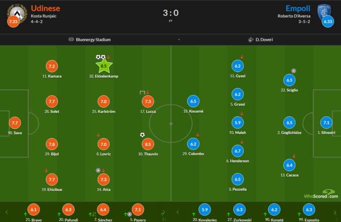 Украинский полузащитник «Эмполи» Виктор Коваленко провел первый матч с мая 2024 года. Он вышел на замену на 85-й минуте матча, результативными действиями не отметился. Статистический портал SofaScore оценил игру украинца в 6.3 балла. WhoScored дал Виктору оценку в 5.9 баллов. Лучшим игроком матча по версии обоих порталов был признан игрок «Удинезе» Юрген Эккеленкамп. на его счету 2 гола и оценки 8.7 и 8.5 соответственно.