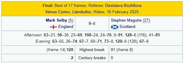 16 февраля в финале 4-кратный чемпион мира Марк Селби из Англии переиграл шотландца Стивена Магуайра (9:6).