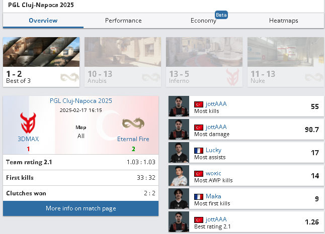 Турецкий клуб Eternal Fire обеспечил себе место в плей-офф PGL Cluj-Napoca 2025, одержав победу над 3DMAX в напряжённой серии со счётом 2:1.