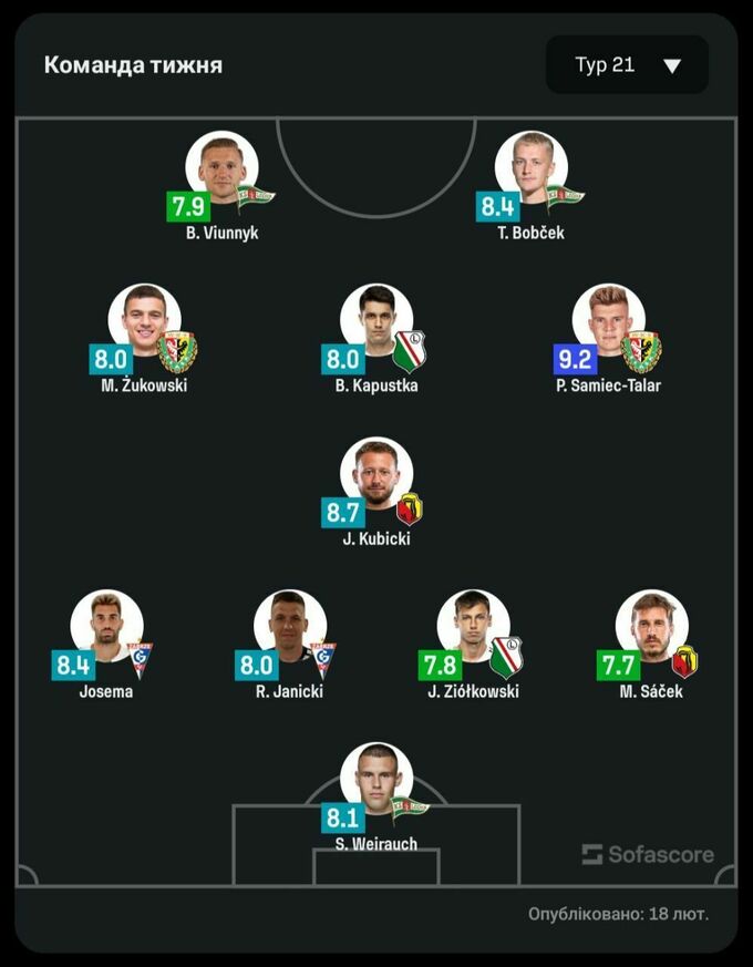 Символическая сборная 21-го тура чемпионата Польши (по версии Sofascore)