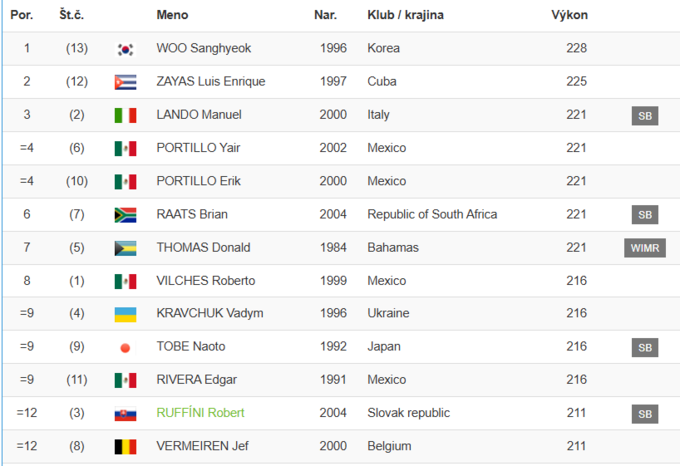На соревнованиях выступил украинский прыгун в высоту – Вадим Кравчук. Вадим Кравчук начал выступления с планки на высоте 211 см, которую успешно перепрыгнул с первого раза. На высоте 216 см Кравчук преодолел высоту со второго раза. Однако, к сожалению, уже на следующей – 221 см, украинец потерпел неудачу, завершив выступления в соревнованиях, разделив 9 место с Наото Тове (Япония) и Эдгаром Риверой (Мексика).