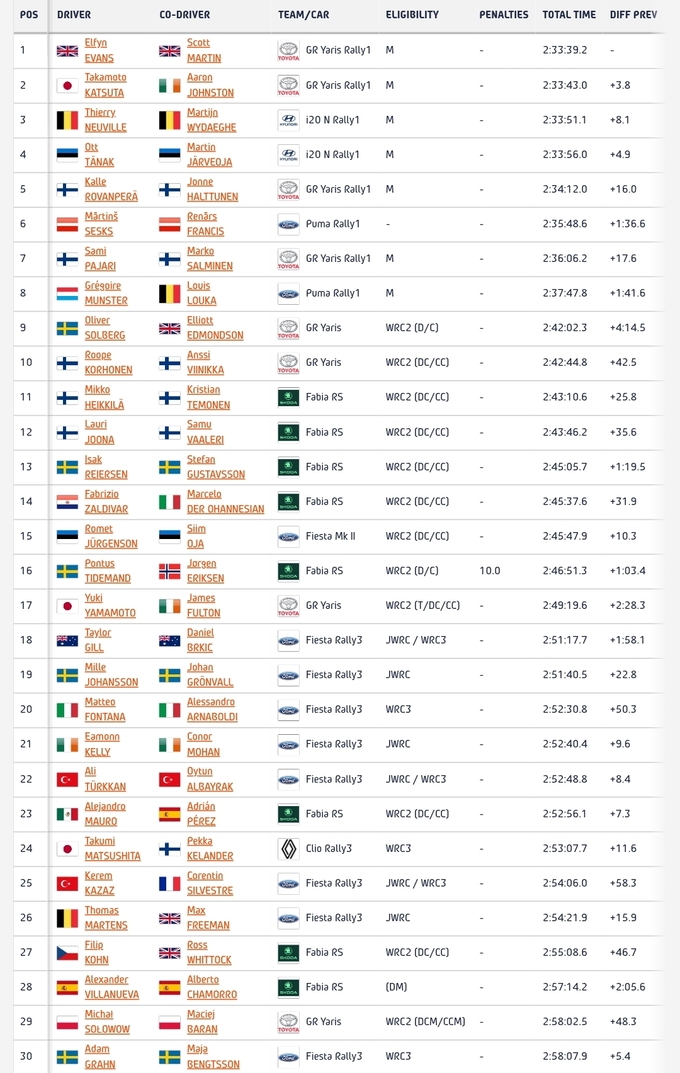 Второе место занял японский гонщик Такамо Кацута, также из команды Тойота Gazoo Racing WRT, отстав от лидера всего на 0,1 секунды. Его напарник по команде, бельгиец Тьерри Нёвилль, занял третью позицию, уступив Эвансу 1,2 секунды.