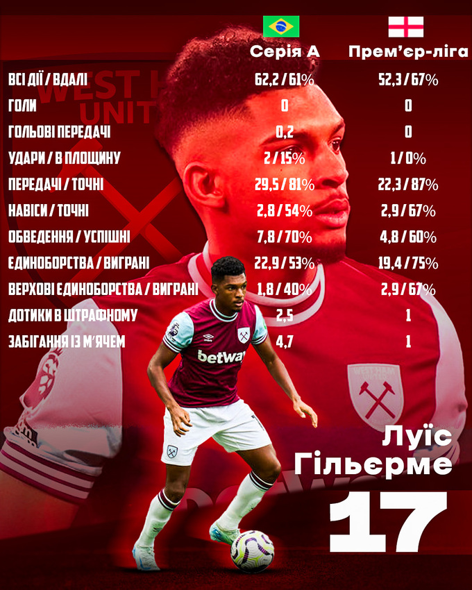 Пока за «Вест Хэм» Луис Гильерме сыграл только 55 минут в рамках 8 официальных матчей, не отличившись голевыми действиями. В АПЛ на его счету 7 поединков и в общей сложности лишь чуть более одного тайма игрового времени – 50 минут. При этом, продвинутая статистика Гильерме в самой сильной национальной футбольной лиге мирового футбола даже на фоне того, что ему раньше удавалось демонстрировать в бразильской Серии А, выглядит весьма и весьма пристойно. Даже излюбленных обводок на Туманном Альбионе в среднем за матч в активе Луиса почти 5 с довольно высоким уровнем их успешности (60%).