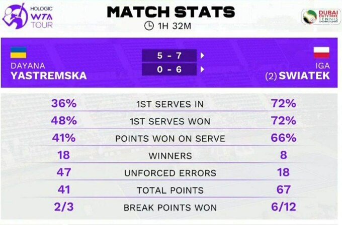 Украинская теннисистка Даяна Ястремская (WTA 48) завершила выступления на хардовом турнире WTA 1000 в Дубае, ОАЭ.