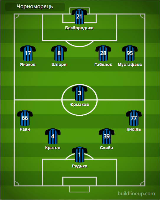 «Черноморец»: Рудько – Раян, Кратов, Скиба, Кисель – Ермаков (Робакидзе, 71) – Янаков (Попов, 71), Шпорн, Габелок (Хобленко, 76), Мустафаев (Кайо, 89) – Безбородько (Шевцов, 89).