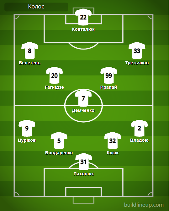 «Колос»: Пахолюк – Цуриков, Бондаренко, Козик, Владою (Поправка, 70) – Гагнидзе, Демченко, Ррапай (Ореховский, 85) – Велетень (Денисенко, 85), Ковталюк (Боливар, 70), Третьяков (Алефиренко, 70).