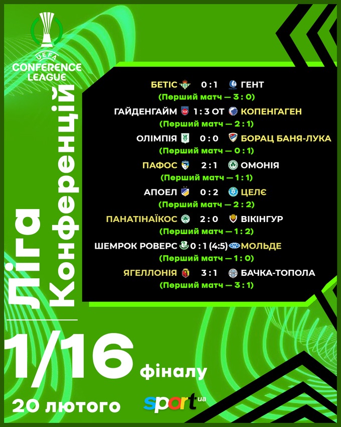 Вечером 20 февраля cостоялись ответные поединки 1/16 финала Лиги конференций.
