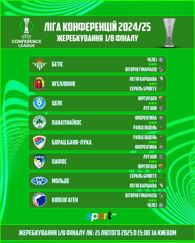 21 февраля в 15:00 по киевскому времени в швейцарском Ньоне состоится жеребьевка 1/8 финала Лиги конференций УЕФА 2024/25.