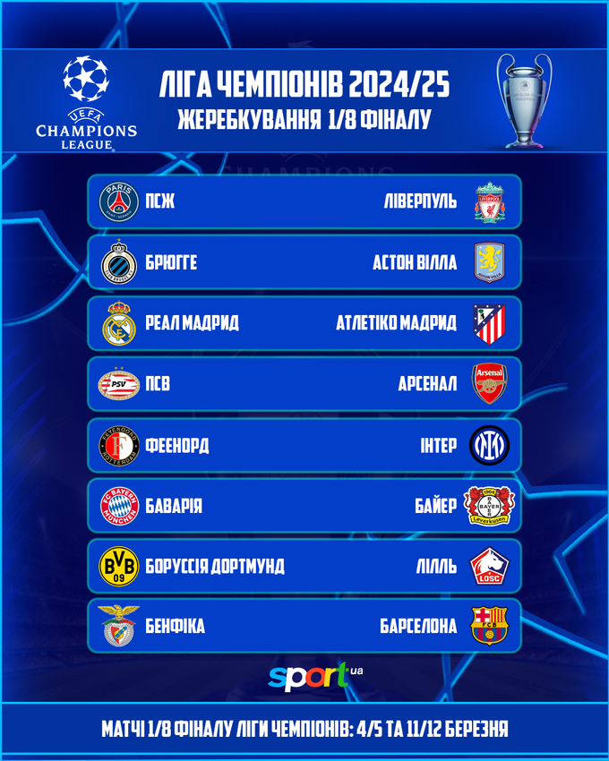 21 февраля в 13:00 по киевскому времени в швейцарском Ньоне состоялась жеребьевка 1/8 финала Лиги чемпионов УЕФА 2024/25.