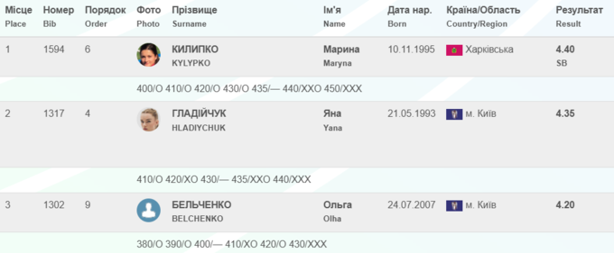Победу в женской дисциплине одержала Марина Килипко, с результатом 4.40 метров. Серебро взяла Яна Гладийчук – 4.35 м, а третье место у Ольги Бельченко – 4.20 м.